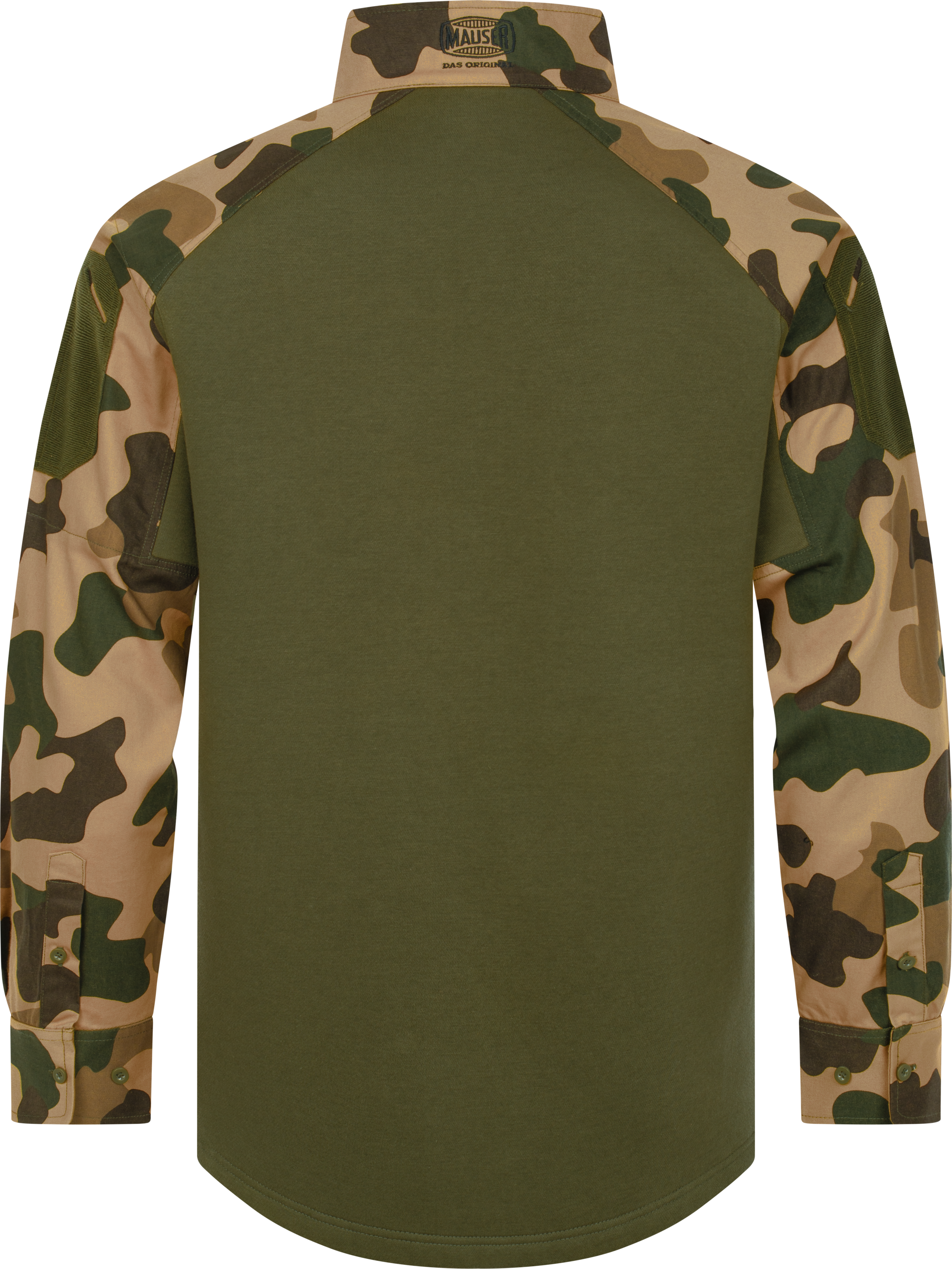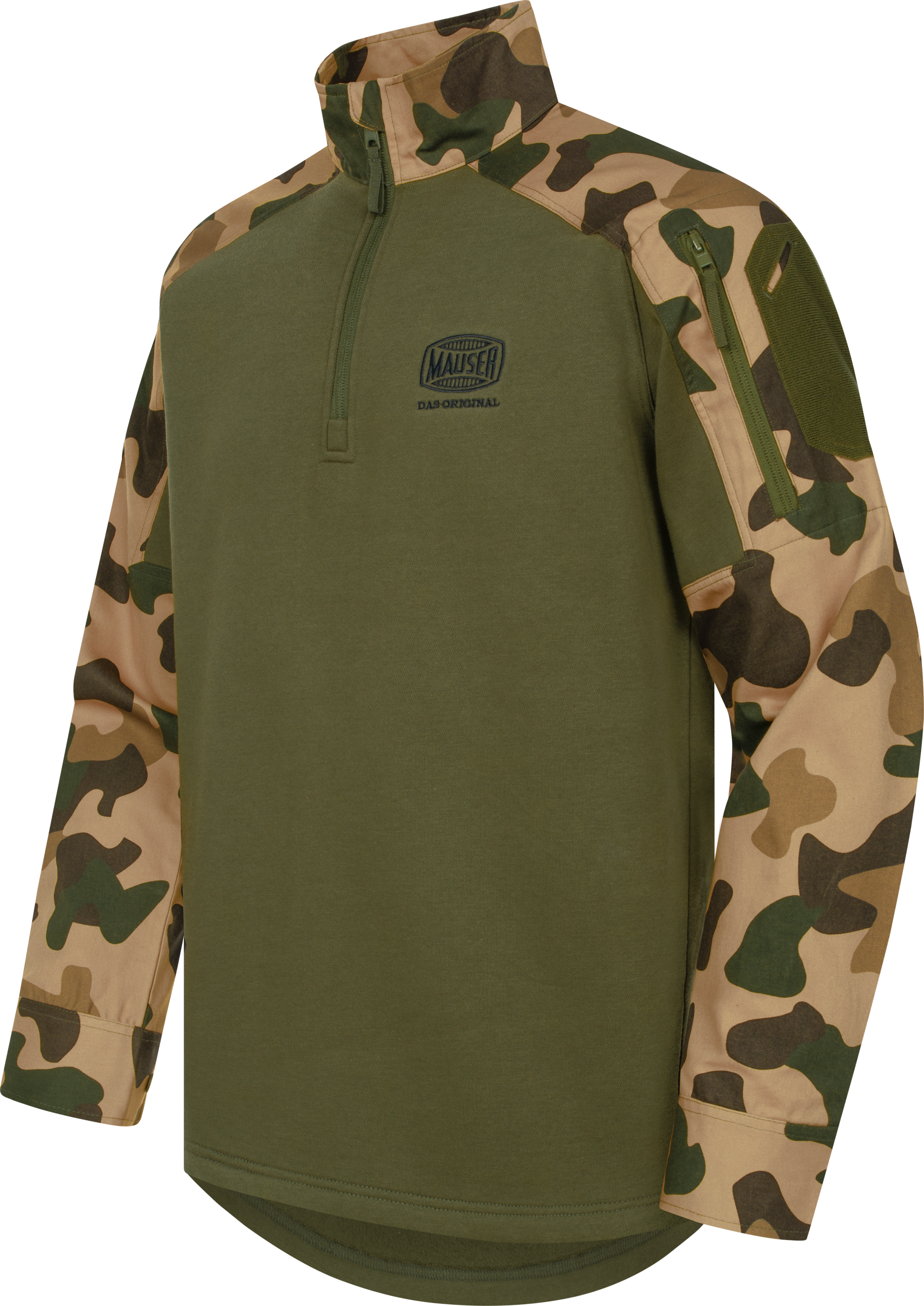MAUSER range sweater combining shirt and sweater design with breathable knitted torso and camo sleeves.